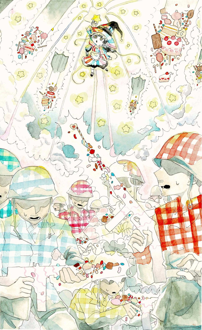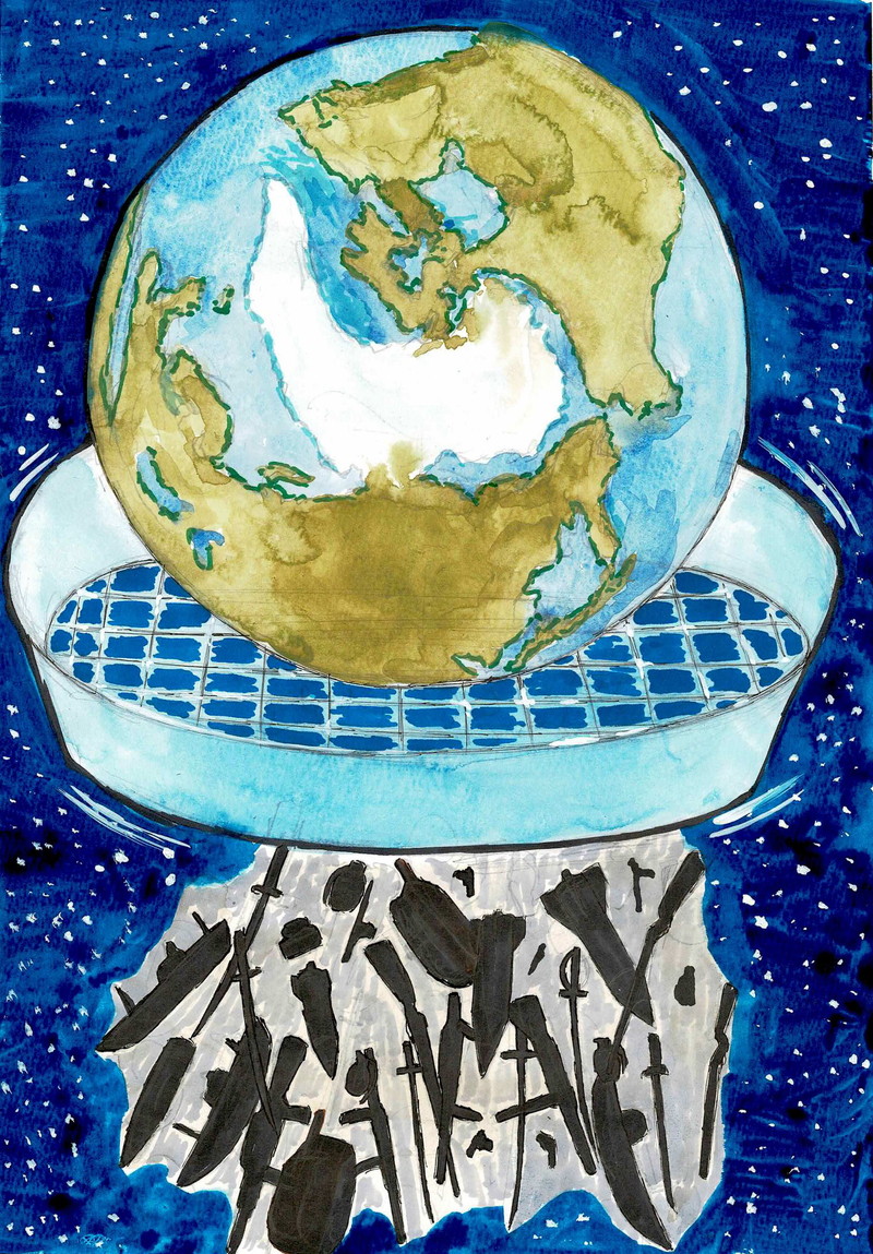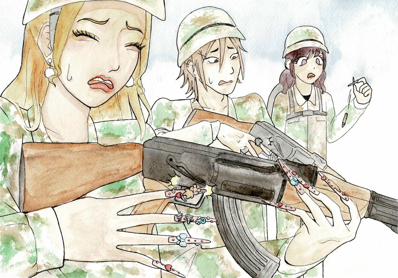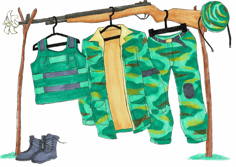 特別賞ここに描かれていない兵士の、武装を解いて半裸になった姿などを想起させる、単純だけど奥行きのある作品だと思います。人を殺すことの象徴である銃を物干しざおに転換する単純なアイデアが、かえって戦争行為の根本を捉えていて秀逸です。軍靴と花を添えたのもグッド。(細萱 敦)
